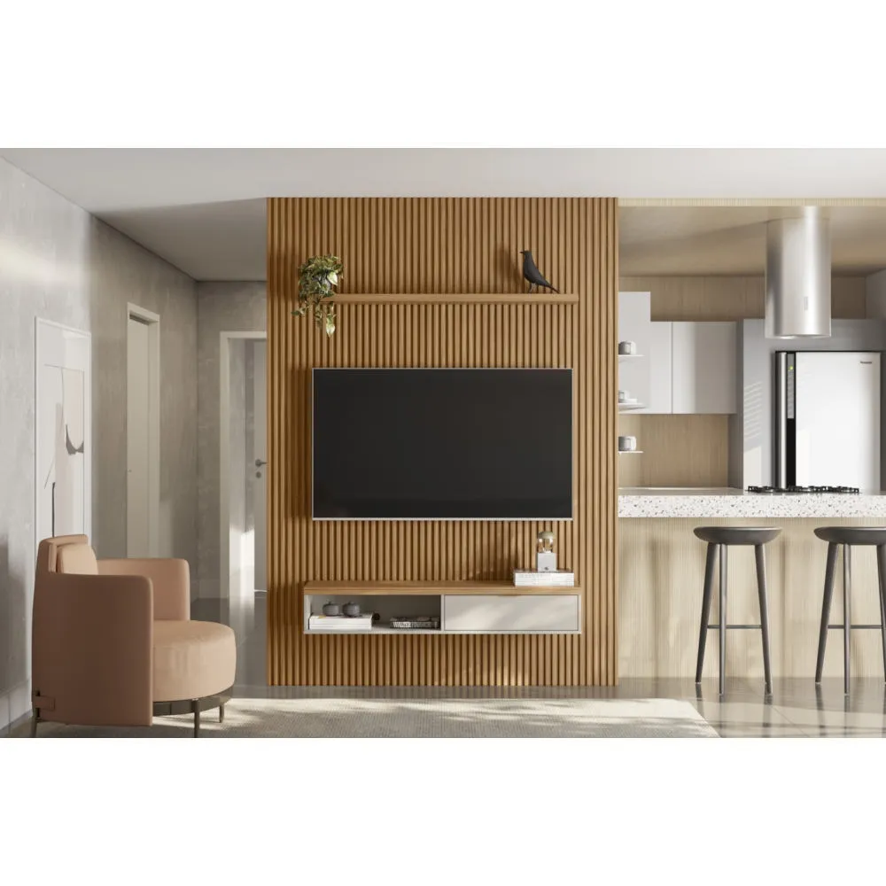 O nicho e a prateleira adicionam funcionalidade: espaço para decodificador, videogame, armazenamento de objetos decorativos ou livros — ajudando a manter a área de TV mais organizada.